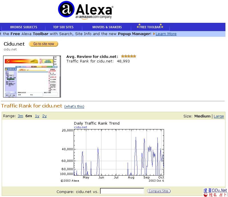 呵呵,今天发现http://www.cidu.net/的排名(alexa.com)又进步了! 现在(2003.10.07):Traffic Rank for cidu.net: 48,993
