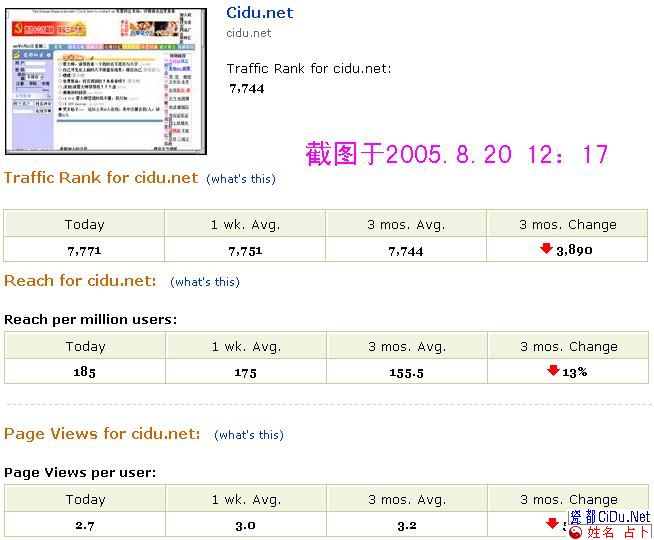 2004-7-13 本站(cidu.net)位居alexa世界排名958名,可惜后来由于一些技术和硬件上的纰漏的缘故,导致排名大跌,今天仅列7744位。目前本站通过努力,有望再度上扬,希望瓷都的网友多多支持。[by