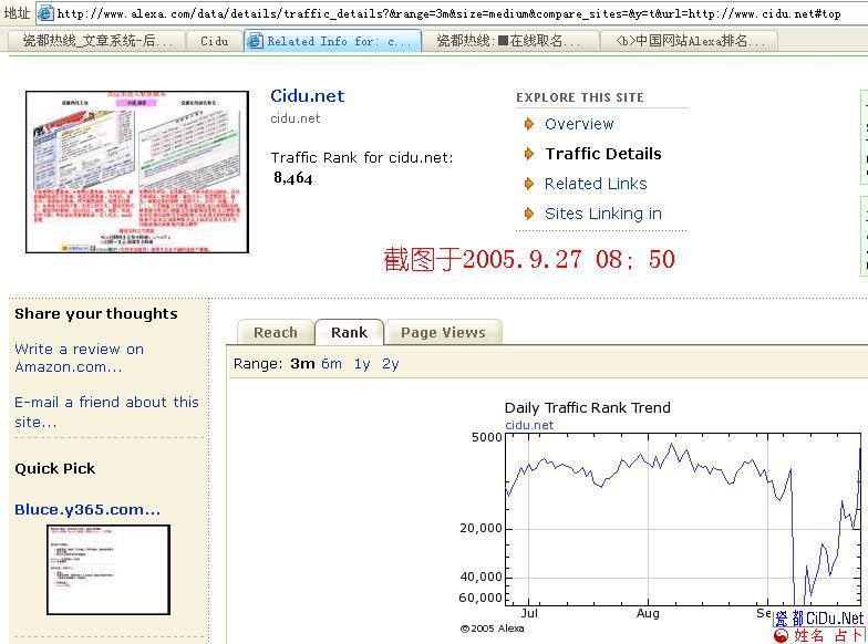 在月初的Alexa排名风暴中(见中国网站Alexa排名再次跳水 大部分跌幅50%)本站也受到了很大的影响,一下也降到了几万名以外,今天终于露出了笑脸,排到了“5,250”的名次,截图纪念如下,再次感谢瓷都网友对我们的支持。