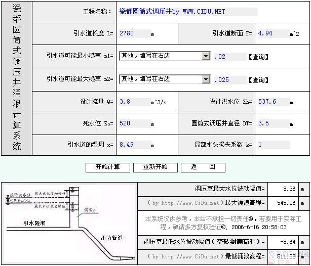为方便广大水工工作者,特别推出免费的在线调压井涌浪计算系统,截图如下: