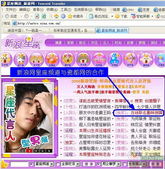 本站姓名频道(http://www.xingming.net)和“新浪网” 合作的取名趣味测算系统于2006年7月17日正式上线,见如下截图: