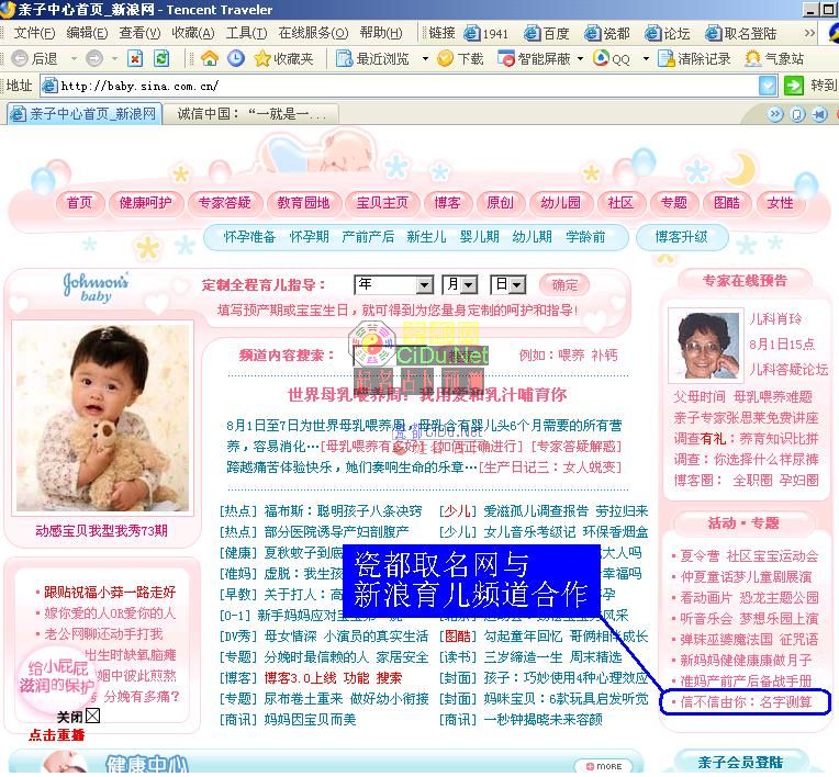 瓷都网(http://www.CiDu.net)之姓名频道(http://www.xingming.net)和“新浪网” 合作的名字测算服务于2006年8月1日也正式上线,见如下截图:(点下图查看详细)