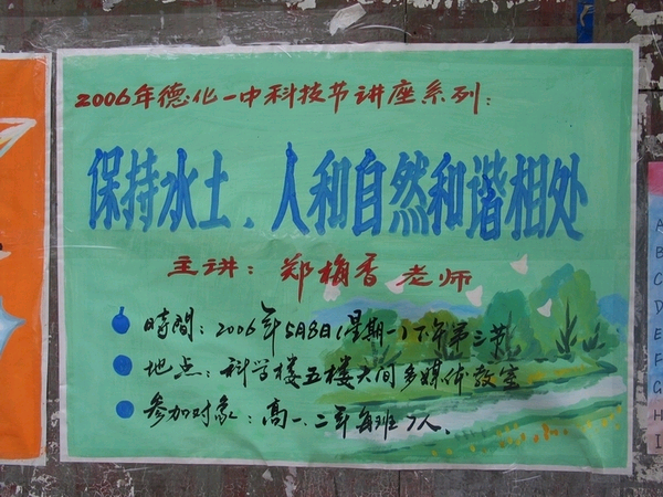 在泉州市青少年“十百千万”水土保持科技传播行动中,德化一中举办了“保持水土,人和自然和谐相处”水土保持科普知识讲座,共有200多名师生参加。讲座中,郑梅香老师就水土保持重要性、水土流失与水土保持、水土流失的危害、水土流失概况、影响水土流失的因素、水土保持综合治理技术和措施和全国水土保持成就等七个方面的内容进行讲述,并结合实例与同学们交流。通过这次讲座,使广大师生充分认识到水土保持的重要性,形成人人关心和参与水土保持、珍惜水土资源的新风尚。