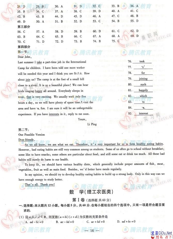 2006年高考(福建卷)英语试题答案