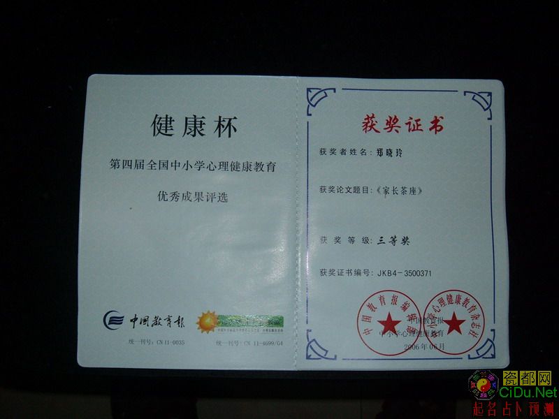 在第四届“健康杯”全国中小学心理健康教育优秀成果评选中,由德化一中学生处心理咨询室及家长学校主办的报纸“家长茶座”获报纸类三等奖。同时,郑晓玲老师的辅导案例《擦拭心灵的窗户――高中生自卑心理辅导》获一等奖,活动设计《学会沟通――蒙眼作画》及调查报告《毕业班学生考试焦虑状况调查》获三等奖。 由《中国教育报》和《中小学心理健康教育》杂志联合举办的“健康杯”全国中小学心理健康教育优秀成果评选活动(下简称“健康杯”评优活动)已经成功地举办了三届。第四届“健康杯”征集优秀成果的时间自2005年1月至2006年3月31日,并于2006年4月至2006年8月评选出优秀成果。评优活动的优秀成果包括:心理健康教育方面的论文、经验总结、辅导案例、活动设计、调查报告、研究报告、感想体会等;以心理健康教育为内容的课件、报纸、刊物、图书、论文集等。评审委员会将按照成果的不同类型分别进行评选。根据评选标准评出一、二、三等奖。一等奖占来稿总数的2%左右;二等奖占来稿总数的12%左右;三等奖占来稿总数的22%左右。主办方向获奖者颁发获奖证书,获奖名单在《中国教育报》和《中小学心理健康教育》杂志上公布。