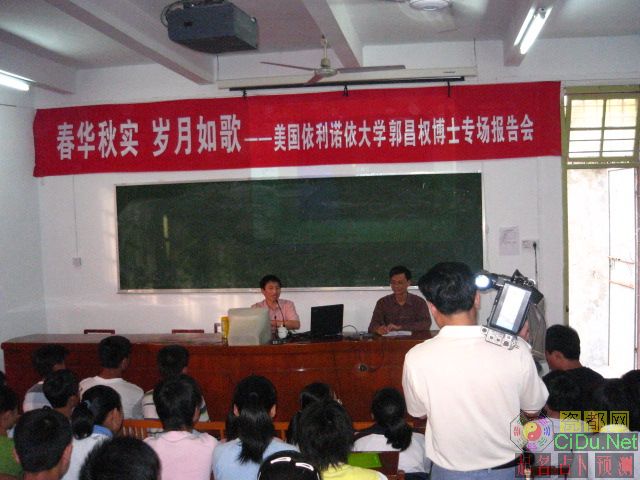 10月20日下午,德化六中邀请回国探亲的美国依利诺依大学郭昌权博士,为全体初三毕业班的同学作了一场名为“春华秋实 岁月如歌”的专场报告会。会上,郭博士向全体同学介绍了自己的人生经历,并娓娓讲述了此次回国的见闻和感想,勉励同学们“自强 、自立、自由—从现在开始准备”,给即将面临升学选择的学生们上了生动有益的一课。 郭昌权博士,祖籍德化上涌。中学时就读于德化二中,福建师范大学毕业后,到厦门大学读研究生,后任教于华侨大学。2001年赴美国依利诺依大学攻读博士学位。现居住在加拿大多伦多,从事计算机软件工作。 报告会上,郭博士借助多媒体生动讲述了现居住地多伦多的生活环境以及工作情况。比较了国内和国外在教育观念和教育方式上的不同。以自己在国外的见闻和中国留学生在国外要经历一个痛苦的适应过程为例,说明了在国外更注重培养学生的独立性。他说,现在国内的变化日新月异,每一天都有很多机会,就看你如何抓住机会。作为一个学生,现在就应该考虑好如何准备独立面对社会。“一个真正的文明进步的国家,不是一群奴才造成的,是要有独立个性,有自由思考的人造成的。(胡适)”他鼓励大家珍惜时间好好学习,“有了学问,好比站在山上,可以看到很远很多东西;没有学问,如在暗沟里走路,摸索不着,那会苦煞人。”只有自强自立,才能站得更高更远。郭博士还从自己爱玩游戏到成为计算机专家讲起,指出了兴趣是学习的动力,希望同学们能多方面培养兴趣,把握开启成功的钥匙。 作完报告后,郭博士还当面和学生作了交流。学生们情绪高涨,提出了很多关于人生思考和学习方面的问题,郭博士一一作答。一方问得犀利,一方答得巧妙幽默,整个现场气氛浓烈,掌声阵阵。整场报告会获得了圆满的成功。 最后,刘校长做了总结发言,他首先代表学校对郭博士在百忙之中抽空前来作报告表示了衷心的感谢,并进一步勉励大家想要改变自身处境,就要努力读书。许多学生当场表示要以郭博士为榜样,自强自立,奋斗不息。//by http://CiDu.Net/