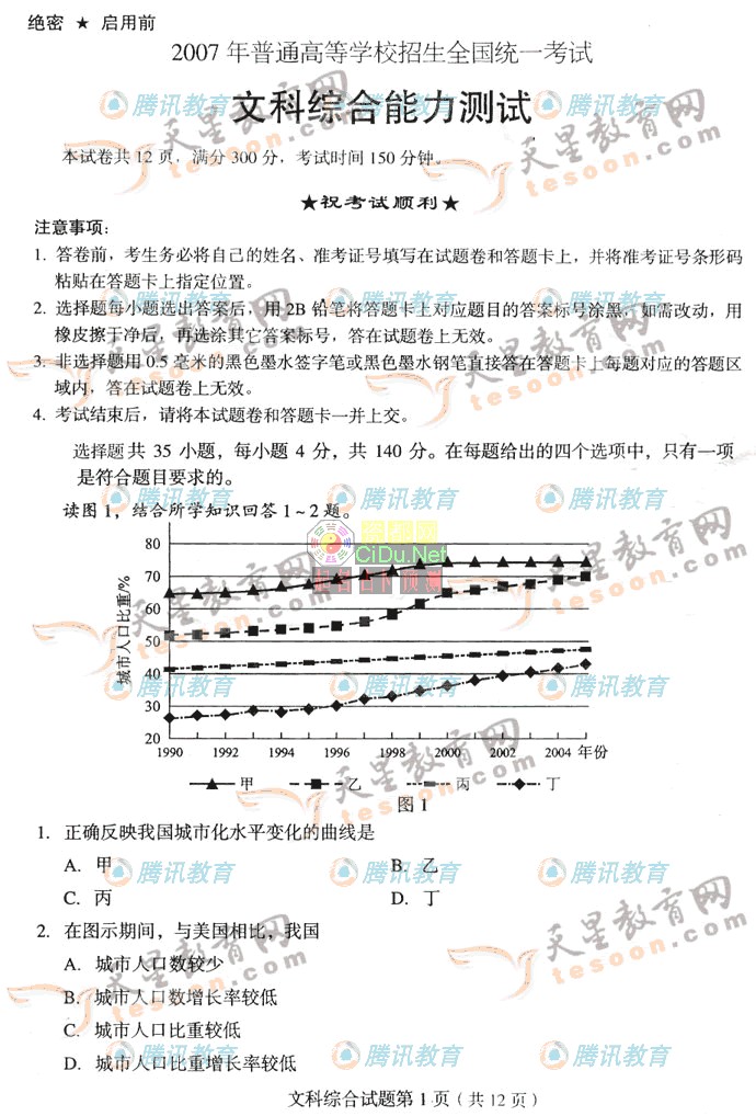 [组图]2007年普通高等学校招生考试全国1文科综合卷         ★★★