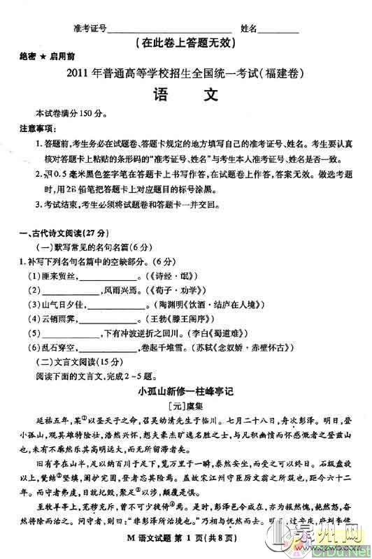 [组图]2011福建高考试题答案上网(语文)           ★★★