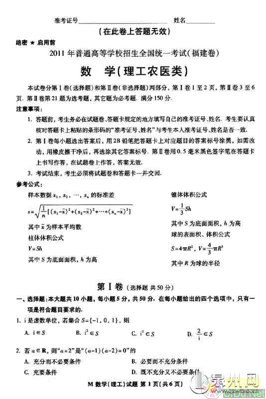 [组图]2011福建高考试题答案上网(数学)(理工农医类)           ★★★