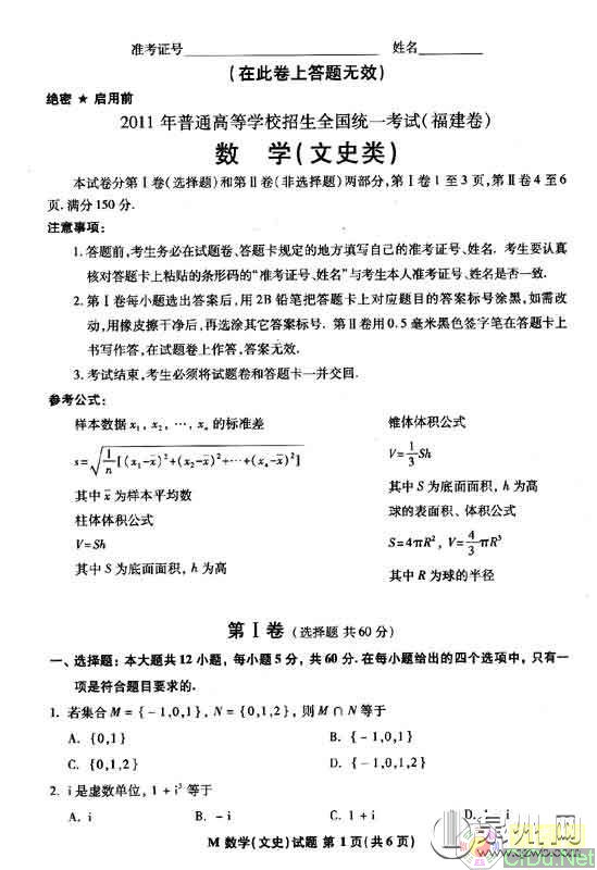 [组图]2011福建高考试题答案上网(数学)(文史类)         ★★★