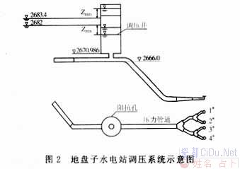 式中 Q1——水轮机增荷前电站的引用流量; T1——电站引用流量增至Q1时导叶开启所需的时间; ——电站引用流量增至Q0时导叶开启所需的时间; -T1——电站由Q1突增至Q0时导叶开启所需的时间; Z0——库水位。 为了真实反映阻抗孔的阻抗系数,本文采用的阻抗系数为实测值。 以上计算方法也适用于简单式调压井,对于简单式调压井,其阻抗系数为零。 5 试验与验证 为了验证数值计算成果,现以青海省地盘子水电站调压井水位波动为例进行验证。该水电站为典型的引水式电站,发电系统由压力引水隧洞、调压井、压力钢管、厂房、尾水渠、升压站及管理所组成。压力隧洞从隧洞进口至调压井轴线总长4 771.74 m。比降i=1/500,采用圆形断面,直径为4.4 m,糙率为0.015,设计引用流量33 m3/s。调压井拟采用圆孔阻抗式,调压井底部高程2 670.986 m,水库设计水位2 682.0 m,校核水位2 683.4 m,水轮机关闭时间4.0 s,水轮机开启时间20 s。在调压井中设有闸门孔,孔宽0.9 m、长3.4 m,它实际上增加了阻抗孔的面积,故在计算时将其与阻抗孔面积统一考虑,本文还对取消闸门孔的工况进行了计算。电站压力引水系统布置如图2所示。
