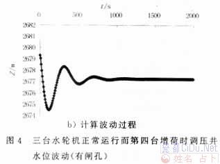 在考虑闸门槽的情况下,已知调压井直径为12 m,阻抗孔直径为2.81 m(闸门孔面积已换算成当量直径),则采用程序计算得在校核水位四台水轮机同时弃荷时,调压井的最高、最低水位分别为2 697.408 m、2 672.979 m;在设计水位三台水轮机正常运行而第四台增荷时,调压井最高、最低水位分别为2 678.328 m、2 674.511 m。以上数值计算和试验结果见图3和图4。