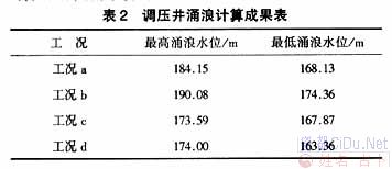 3调压井水力计算 3.1稳定断面面积计算 设计中考虑调压井内水位波动稳定的要求,按(Thoma)准则,托马临界稳定断面面积A=KLA1/2g(α+1/2g)(H0-hw0-3hwm)计算,调压井波动衰减的临界断面取为101.1m2,取调压井大井直径为12m,其断面积113.1m2、为临界断面积的1.12倍。 3.2波动稳定计算 工程正常运行的最大水位变幅为7.26m,最大引用流量Q=34.02m3/s,当两台机在设计工况下满发时,水头损失2.507m。为此按《水电站调压井设计规范》并按井顶有溢流堰情况,选取以下几种工况: (1)工况a。正常水位+2台机全甩负荷(调压井前糙率取最小值,调压井后糙率取平均值,下同); (2)工况b。校核水位+2台机全甩负荷; (3)工况c。死水位+1台机满发+1台机由空转增荷至满发(调压井前糙率取最大值,调压井后糙率取平均值,下同)。 (4)工况d。死水位+2台机由空转增荷至满发。 选取公式:Zmax=Zs-h、h=(Qy/mB)2/3、Qy=yV0A1计算调压井涌浪,算得的调压井涌浪成果见表2。//by http://CiDu.Net/