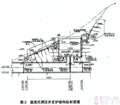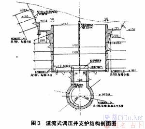 在工况c中,斜洞上弯点处洞顶压力余幅为5.97m,满足规范要求。 4结构设计 (1)施工图设计阶段调压井位于桩号2+666.586m处(图1),井口地面高程约180m。按溢流阻抗式、大井净直径为12.0m(大井断面积113.10m2)设计,井壁衬厚0.6m。调压井井顶高程176.7m,为安全计取引水道最大引用流量34.02m3/s作调压井溢流流量,确定溢流前缘长12.566m,溢流堰宽20m,堰顶高程175.5m(高于坝前水位0.3m)。调压室最低涌浪水位163.36m,取最低涌浪水位与调压室处压力引水道间的安全高度为3m,确定调压井大井底高程为166.3m,高程166.0m处设阻抗口,阻抗孔口直径3m,面积为大井断面的6%(图2)。//by http://CiDu.Net/