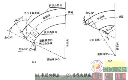 * 非径向拱座:基岩开挖过多时采用,拱座面与基准面的夹角应£80o。//by http://CiDu.Net/