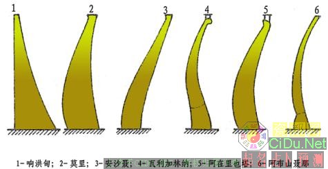 拱冠梁剖面的形态对拱坝的竖直曲率和自重应力有很大影响。以往较广泛采用上游面近于垂直的单曲拱坝,尽管设计和施工方便,但往往很不经济,近代大多数较高的拱坝都采用双典形,即竖直剖面的上下游面均有一定曲率,其明显的优点是可利用坝体自重以减小由上游面水压力引起的坝底上游面以及坝体上部下游面的垂直拉应力,并利用垂直拱的作用,使悬臂梁在水压作用下产生水平变位的同时还有向上变形的倾向,该倾向得到顶拱的支承,从而减小了悬臂梁的弯矩,使拱的应力状况得到改善。图3.11是几个典型拱坝的拱冠梁剖面图。//by http://CiDu.Net/
