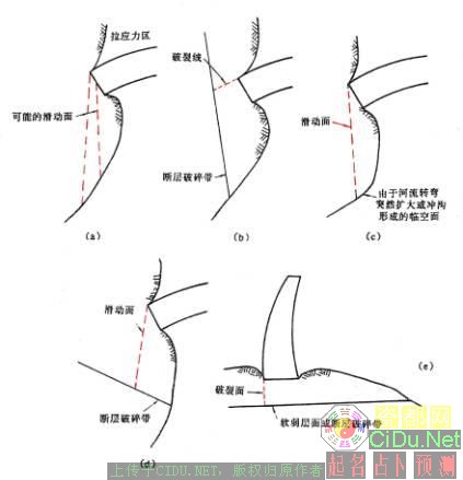 ③滑动岩体底部有缓倾角节理裂隙或软弱夹层面(图3.16,e)。//by http://CiDu.Net/