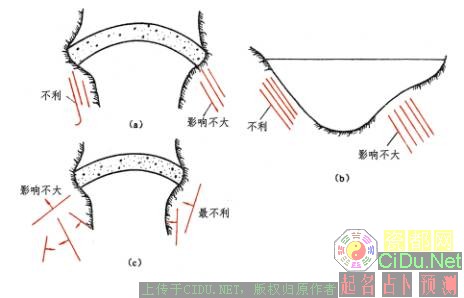平行河流方向或向河中倾斜的节理可能导致滑动,而在下游逐渐斜入山内的节理、裂隙则对稳定影响不大(图3.17)。//by http://CiDu.Net/