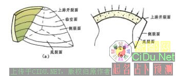 ①在坝的上游面基础内存在水平拉应力区,有产生铅直裂缝的可能,因此滑动体的上游边界一般假定从拱座上游面开始(图3.16,a);若坝肩附近有顺河向断层破碎带,则有可能在断层破碎带与拱座间的岩体处发生破裂,然后沿断层破碎带向下游滑移(图3.16,b)。//by http://CiDu.Net/