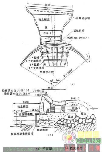 坝基开挖 高坝一般应开挖至新鲜或微风化的下部基岩、中坝应尽量开挖至微风化或弱风化的中、下部基岩。整个坝基利用岩面的纵坡应平顺而无突变,拱端开挖应注意本章第三节所述的拱端布置原则。河床覆盖层原则上应全部挖除,如有困难,应在结构上采取措施。例如贵州猫跳河窄巷口拱坝,高39.5m,因河床覆盖层较厚,采用双拱坝体型,以基础拱桥跨过覆盖层,并用两排混凝土防渗墙作为覆盖层防渗(图3.24)。//by http://CiDu.Net/