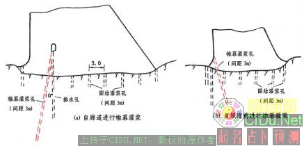 帷幕灌浆 帷幕线一般布置在压应力区,并尽可能靠近上游面。帷幕灌浆可利用坝体内的廊道进行(图3.25,a);当坝体较薄或未设廊道时,可在上游坝脚处进行(图3.25,b)当有坝头绕渗,将影响拱座岩体稳定,或将引起库水的水量损失时,防渗帷幕还应深入两岸山坡内,与重力坝的情况类似,但要求应更严格。//by http://CiDu.Net/