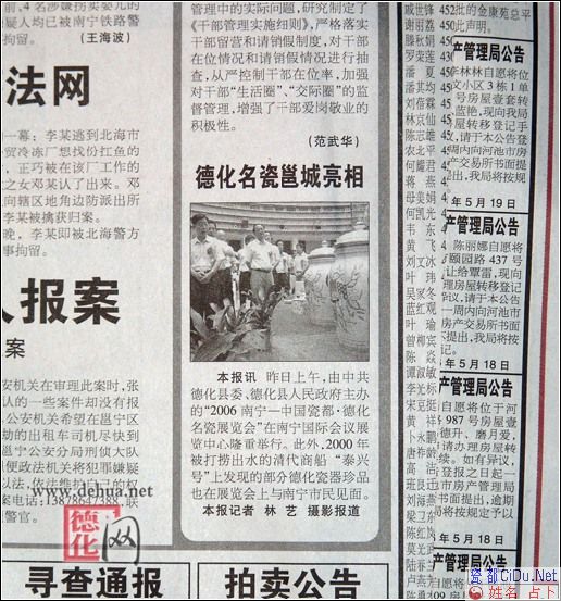 昨日上午,由中共德化县委、德化县人民政府主办的“2006南宁——中国瓷都·德化名瓷展览会”在南宁国际会议展览中心隆重举行。此外,2000年被打捞出水的清代商船“泰兴号”上发现的部分德化瓷器珍品也在展览会上与南宁市民见面。//by http://CiDu.Net/
