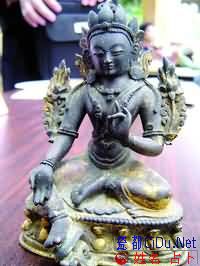 当天现场价值最高的古董是一尊清代早期的藏佛鎏金铜像,藏佛很小,可以捧在手心,腰身细细的,佛像制工精细,纹路清晰,每个细节都很讲究,连手上所结法印这样的细部都清楚自然。只是年代久远,外层的金膜大面积脱落,铜也氧化了,露出乌黑的底色,看起来并不显眼。佛像的主人李先生介绍说,上世纪80年代,有人打算把这尊佛像卖给一个外国人,他觉得这佛像不错,于是花了1200元把它买了下来。专家证实李先生慧眼识货,这尊佛像如今的价值已经翻了好几倍,少说也有上万元。