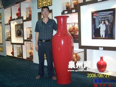 商报讯 历经数年的努力,国内目前高度第一,1.58米的红釉瓷瓶日前在德化富贵红艺术陶瓷厂烧制成功。据了解,该产品的成功烧制,结束了德化没有大型红釉瓷瓶的历史,同时也填补了国内烧制大型高温大红釉瓷的空白。