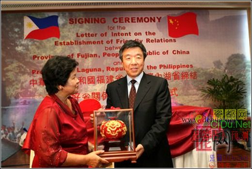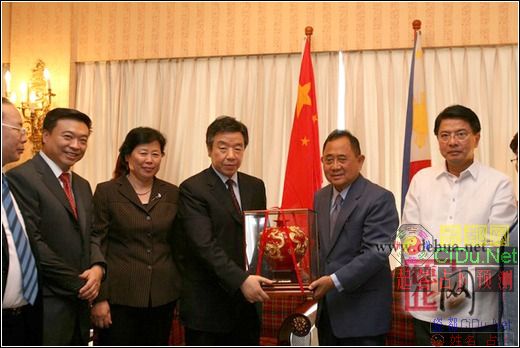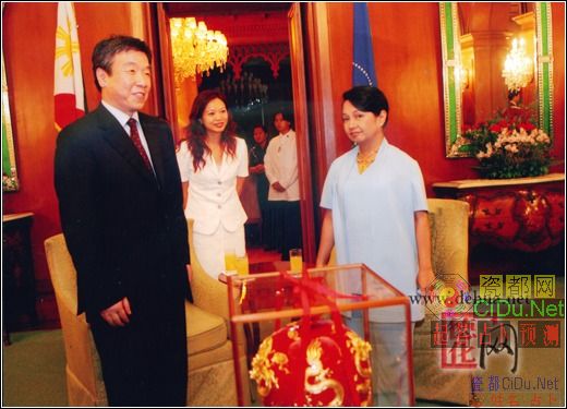 2006年6月18日,中共福建省委书记卢展工率团到菲律宾参观考察。在菲律宾马尼拉总统官邸,阿罗约总统高兴地接受了卢展工书记赠送的象征“富贵吉祥”的富贵红礼品。//by http://CiDu.Net/