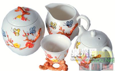 手绘声绘色梅花浮雕茶具,既实用又美观,又具有收藏价值.