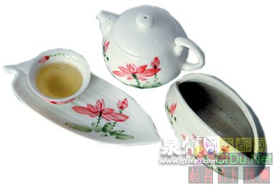 白冰裂手绘荷花茶具:优美的图案赋予茶具极高的观赏价值.