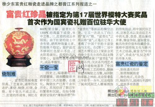 历史上,福建德化、江西景德镇、湖南醴陵曾并称中国三大古瓷都。在德化,陶瓷生产已有干余年历史,其间经历了数百年的繁荣和沉寂,而如今随着国宝级的“薄胎彩塑"和“富贵红”等新品的横空出世,它又一次进入了自己的“复兴”期。“富贵红”之所以称“富”,正是在它身上承载了中国千年的丰富瓷品与文化。在《第十二届中国艺术博览会》上荣获金奖的徐少东先生的作品《龙腾盛世》就隶属于“富贵红”漆线雕系列,仅该系列的艺术品就奇迹般地荟萃了中国三大传统工艺的特色,除融景德镇陶瓷之古雅,福州脱胎漆器之神韵,北京景泰蓝之华彩于一身外,它还吸取了闽南民间艺人雕琢绣饰的传统技法,将中国民俗艺术、宗教艺术以及宫廷艺术中的礼器、祭器、贡品兼收并蓄,镏金饰银,富丽堂皇,极具欣赏价值和收藏价值,堪称中国传统文化与新兴艺术之结晶,被誉为“中国艺宝”。并成为“礼仪之邦”的形象大使。//by http://CiDu.Net/