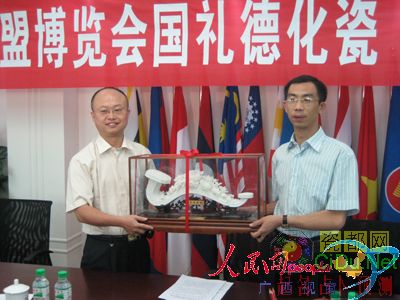 中国-东盟博览会秘书处副秘书长杨京凯在新闻发布会上向博览会合作企业福建德化大千瓷苑代表颁发了证书。这份国礼的作者郑少伟说,国礼上刻有11国最具代表性的花卉,它们表达了中国与东盟互利合作、共享繁荣明天的美好愿望。