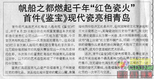 首件现代高温艺术红釉瓷入选央视《鉴宝》栏目,并于8月23日起分别在央视重复播出8次的瓷都德化富贵红公司出品——“天地方圆”瓷器,今日首次亮相帆船之都——风景如画的青岛市。这是《鉴宝》栏目首次被人选现代德化瓷在青岛的首次展示,这无疑给海滨城市的帆船大赛呈现出一片热烈吉祥的色彩。本次展示的富贵红高温红釉国宾礼品瓷超过百件,以不同的艺术造型再现了千年瓷都火与水的永恒魅力。//by http://CiDu.Net/
