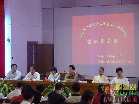 2006年11月4日,泉州市潘燕燕副市长,中国陶瓷工业协会副秘书长侯文全、黄芯红,德化县李辉跃县长,省科技厅高新处王志峰科长,德化县吴志伟副县长、助理调研员黄发建;厦门大学熊兆贤教授、韩金轮,华南理工大学周曦亚教授,中科院上海硅酸盐所董显林教授等领导和嘉宾出席了在德化陶瓷职业技术学院举行的“‘泉州市先进陶瓷成果展示与高级论坛’德化展示会”。会议由泉州市科技局局长吴中培同志主持,李县长致欢迎辞,潘副市长、黄副秘书长分别在会上做了重要讲话。会后,中国材料研究学会会员周曦亚教授作了题为“特种陶瓷及其应用”的专题讲座。德化县相关领导及科技副职干部、陶瓷企业代表和德化陶瓷职业技术学院师生230多人到场参加。//by http://CiDu.Net/
