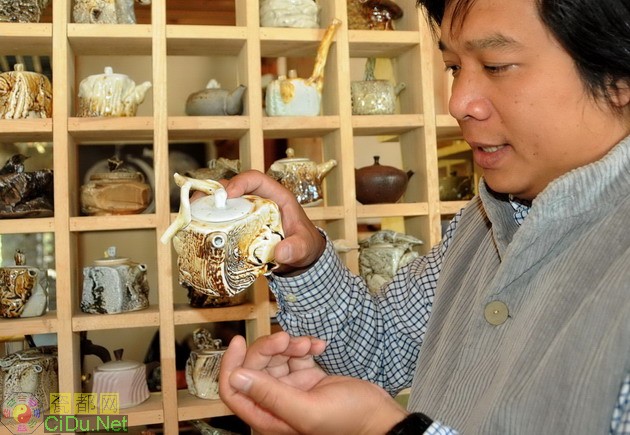 福建省文化产业示范基地——月记窑国际陶瓷文化创意产业园的吴金填在介绍艺术创意茶壶的设计体会(10月21日摄)。(XMW)