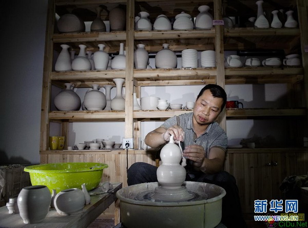 5月9日,在福建省泉州市德化县的顺美集团公司,工人在拉胚制作传统陶瓷工艺品。 新华社记者 姜克红 摄