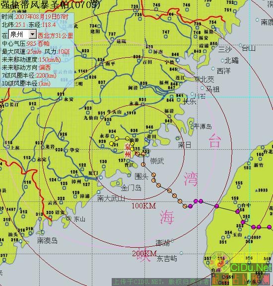 最新台风动态:强热带风暴圣帕08月19日07时位于北纬25.1度,东经118.4度,即在泉州西北方31公里,中心气压985百帕,近中心最大风速25米/秒,相当于10级风力,移速15公里/小时,移向偏西。圣帕台风紧急警报期。泉州市气象局。//by http://CiDu.Net/
