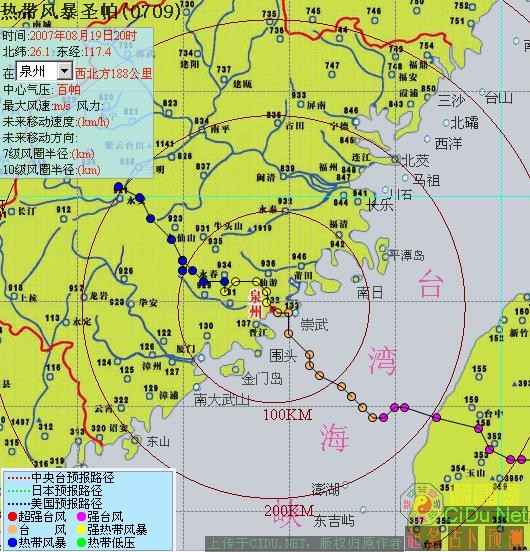 最新台风动态:热带低压圣帕08月19日20时位于北纬26.1度,东经117.4度,即在泉州西北方188公里,中心气压995百帕,近中心最大风速17米/秒,相当于7级风力,移速15公里/小时,移向西北。泉州市气象局。//by http://CiDu.Net/