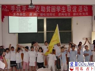 7月26日,市“追寻红色之旅”夏令营手拉手资助贫困学生联谊活动在第二实验小学举行。全体夏令营成员和该校部分贫困学生代表参加了联谊活动。 据悉,市“追寻红色之旅”夏令营活动由泉州广播电视报、泉州电信联合组织发起的,来自全市各地的近百名中小学生参加了活动。到我县第二实小开展与部分贫困学生手拉手互助联谊活动是他们此行的第二站。为更好地筹集资金举行此次互助联谊活动,此前,他们在市区举行了较大规模的义卖活动。联谊活动中,营员们向该校贫困学生赠送了由义卖活动所筹款项购买的T恤、书籍和学习文具等物品。之后,营员们和该校贫困学生代表一道载歌载舞,举行了丰富多彩的联谊活动。//by http://CiDu.Net/