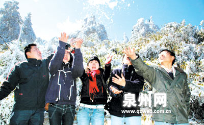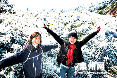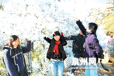 沿着九仙山盘山公路蜿蜒而上,及近峰顶,白茫茫的雾凇漫山遍野。“这太美了,就像仙境一样,真没想到在南方也能看到这种美景。”游人陈小姐兴奋说道,她和朋友一早就开车上山来。得知九仙山有雾凇,山下的许多游人闻讯纷纷驾车而来,嬉戏在这皑皑世界。一群穿着红衣的妙龄少女,格外引人注意。她们手捧雪白的树挂,互相打闹,不亦乐乎。德化旅游局的相关负责人也带着相机赶来,他说:“这个时候出现雾凇是比较少见的,早上特意赶过来拍一些照片,可以成为介绍德化风景的宣传片。”