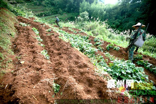 昨晚被野猪糟蹋的地瓜种在格头村一座山的半山腰,那里有成片的梯田和地瓜。按照村民的指引,我们找到被野猪拱过的地瓜地。