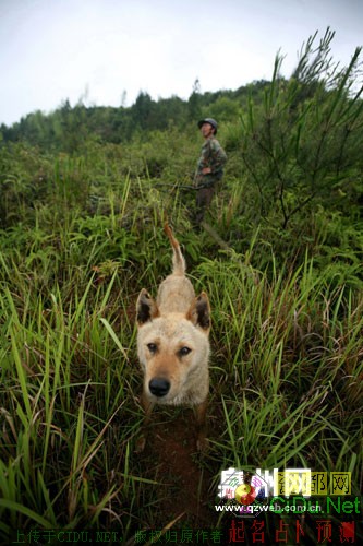 猎人带着猎狗在山上寻找野猪走过的痕迹。//by http://CiDu.Net/