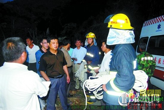 救援人员拿着绳子准备下到山谷救人