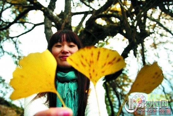 银杏叶金黄,风吹过处,满地落金,山中小道因此铺上厚厚的金叶。踩上去,脚步轻盈,发出“沙沙”的声音,恍然间,一行人犹如走入一片金黄色的海洋。捡上几片叶子细看,银杏叶如同一面小型的扇子。此时一阵微风轻拂,银杏叶飘飘洒洒,犹如天女散花。好一个飘渺而浪漫的世界!