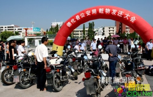8月4日上午,福建德化在瓷都广场举赃物发还大会,将近段来破案追回的23辆摩托车、7000多件服装、12万元现金,以及手机、照相机、电视机、金银首饰等价值共58万元的财物发还给失主。(陈文良 郑培峰 摄)