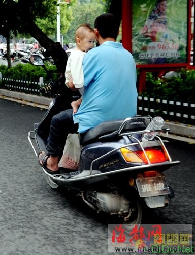 东南网-海峡都市报6月22日讯(记者 田米) 昨日下午5点45分,在德化城区德化广场边上,一年轻人一手骑车子,一手抱小孩子(如图)。男子骑车还挺快,不过路人还真为孩子捏了一把汗。(XMW)