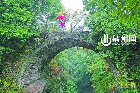 德化县城人林惠鑫以前就出生在龙漈村,熟悉周遭的地形,他带着我们来到一处地势较低的溪岸边。从这里观察桥身,不难看出,霸王桥是个单孔石拱桥,由长石条作拱。桥下是一个涧谷,幽深莫测,桥的两端刚好触及两边山道。整座桥就像是挂在崖壁上似的,地势极其险峻。(XMW)