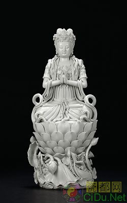 右图为清代-德化窑观音坐莲像(德化窑观音坐莲像,估价:¥600,000~800,000 。观音头戴华丽的宝冠,冠上并饰有化佛。脸相丰腴,流露一股慈悲的祥和气息。胸前双手结合掌印。双足全跏趺坐,下承莲花宝座。底部并署有“博及渔人”雅号款。)