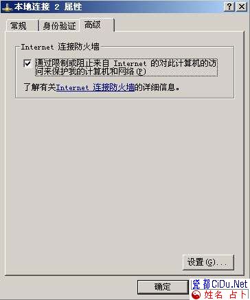 一、基本设置 1、鼠标右键单击“网上邻居”,选择“属性”。 2、然后鼠标右键单击“本地连接”,选择“属性”,出现图1界面。如图选择“高级”选项,选中“Internet连接防火墙”,确定后防火墙即起了作用。//by http://CiDu.Net/